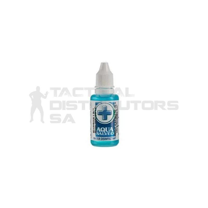 - Aqua Salveo water disinfectant is a metal salts solution that disinfects water within 30 - 60 minutes and remains disinfected for extended periods. Great for emergency relief, camping/outdoors, survival and everyday use. (Water tanks etc.)